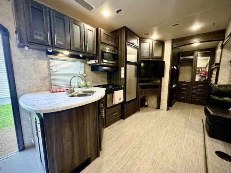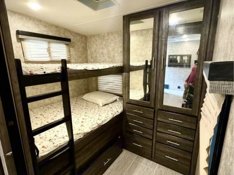 Spacious 5th wheel camper designed for max space and comfortable sleeping arrangements! Starting front the front. Camper comes with a memory foam queen bed with a slide out to gain more room! Large stand up shower! Large bathroom. Open kitchen with large U shaped sleeper sofa. Also has two tables that pop up to make use as a dinning room on a mega slide. Two twin Xl bunks with sliding door for privacy. Outdoor kitchen, audio and awning!Ce qui est inclus• Linens