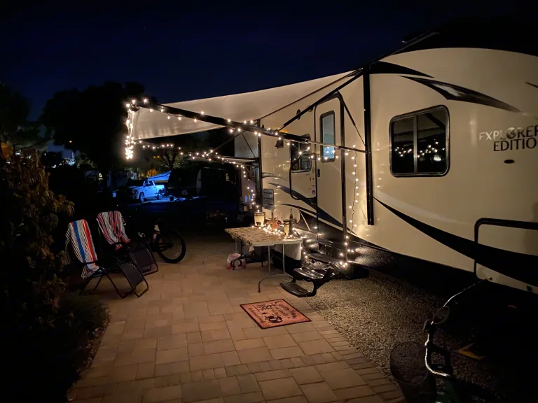 Beautiful travel trailer with out door kitchen, huge awning and exterior floor coverings