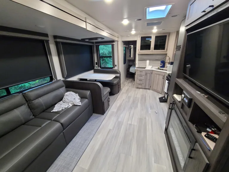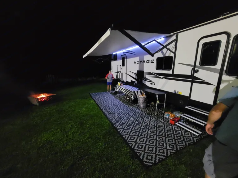 The awning is motorized and has led lights that can be turned on at night time. The camper has outdoor speakers that are bluetooth capable and work with indoor tv as well. The roof has solar panels that will charge the battery and allow for USB charging even if electricity is out during your stay or if you are not hooked up.