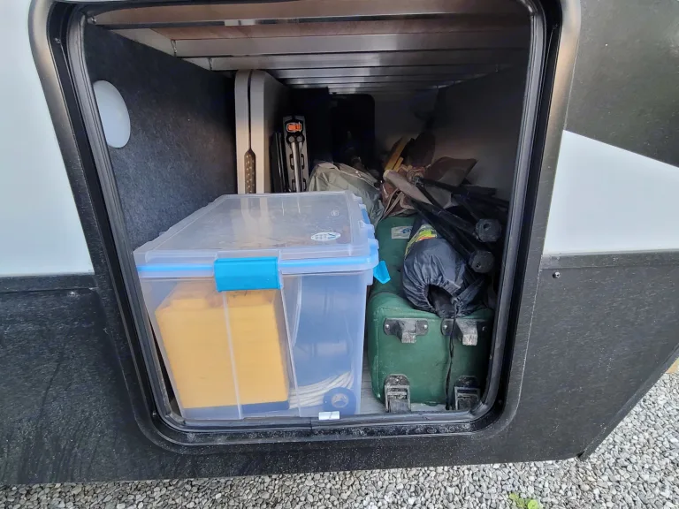 The outdoor kitchen has a small sink, small fridge and a griddle to suit all your needs. The rear of the camper has an access door that we have installed a storage unit that holds grilling utensils, outdoor cleaning supplies and hoses. The undercarriage storage area is equipped with a large tool set, 6 ft folding table, 4 ft bar height table, and many other outdoor accessories. The family camper comes with a 20 ft by 8 ft outdoor rug that spans the entire area between both doors.