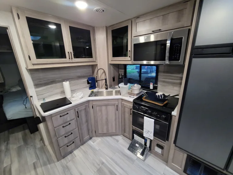 The leveling jacks are motorized. By the water hook ups there is an outdoor shower area that can be used to spray down after a fun filled day! The electric hook up is for 50 AMP. There are 2 gray tanks and 1 black water tank on the camper.Ce qui est inclus6 camping chairs, 2 tables, linens, towels, cookware, utensils, dinnerware, small crock pot, cutting boards, storage containers and zip lock bags, cleaning wipes, kitchen towels, kpods, wine opener, chip clips, baking dishes, knife set, movies, books, games, first aid kit, blow dryer, and hair straightner.RecommandationsHolmes county has many camping areas in Amish country that will suit just any type of camper needs. The Amish area so beautiful and peaceful to drive through. There are many local shops to stroll through as well as unique eating!