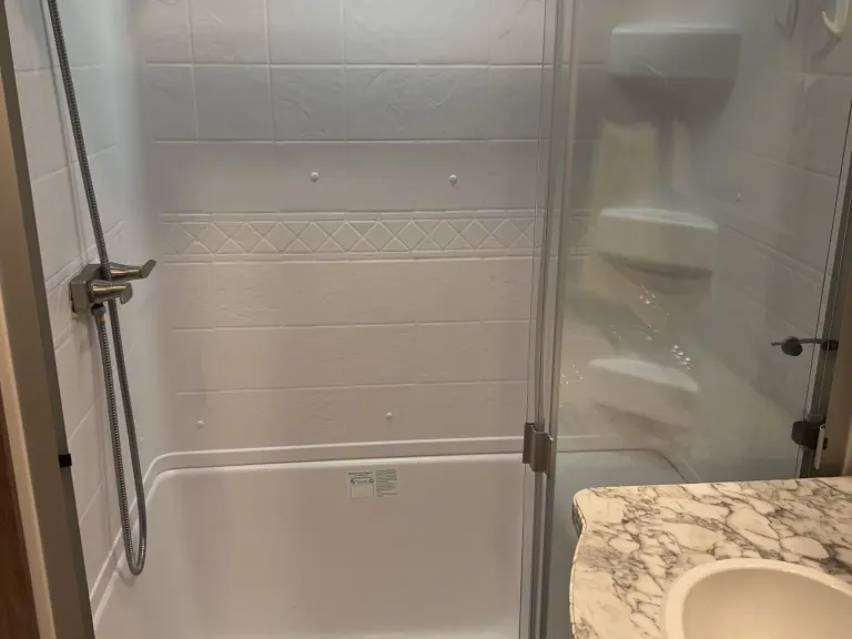 A set of recliners, 3-person couch, and a large entertainmentThe bathroom is a stand-up shower with cabinets above and below the sink and a linen closet.