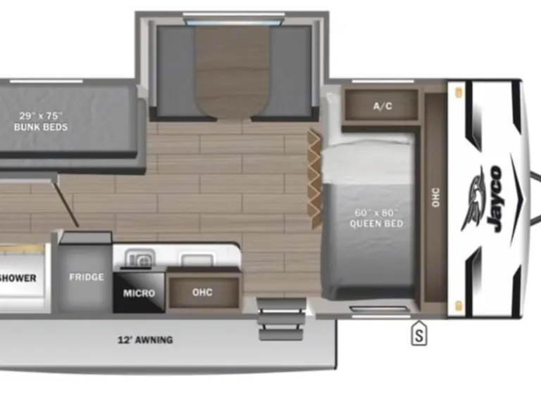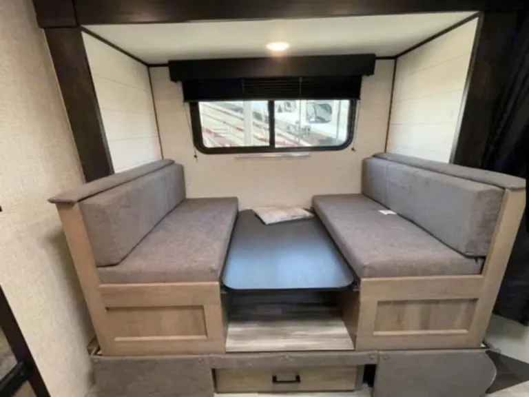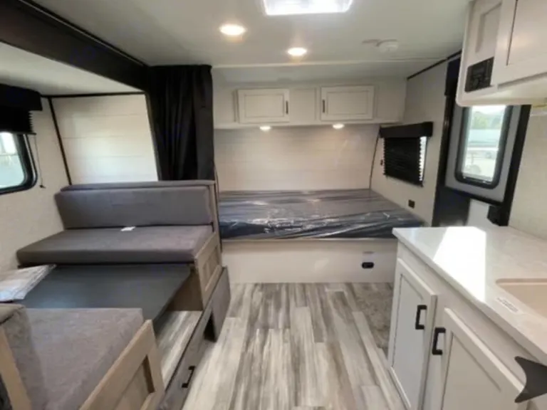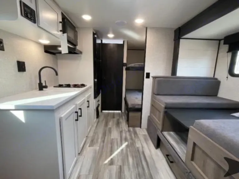 • Spacious Interior: Despite its compact size, the interior is thoughtfully designed to maximize space and comfort. The layout includes a comfortable queen bed, a convertible dinette, and bunk beds, sleeping up to 5 guests.
