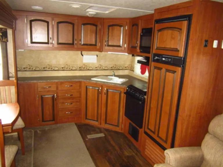 My Travel trailer is really cool to camp in. King size bedroom full kitchen large living room. Two slides. Model 322 FKS. Check it out online .