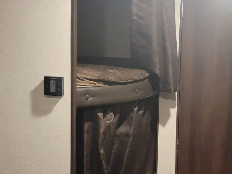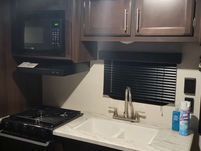 Very nice newer camper. Can't use the awning. The awning arm is broken and we are waiting for the parts. The price has been reduced. The part is on Has a kitchen that includes a refrigerator/ freezer, sink and stove with oven. Bathroom has a bathtub/ shower with sink. Camper also has an outdoor shower and water hookup. Great camper for any gateway. Ce qui est inclusBedding and pillows are included and freshly cleaned. Camping chairs also available to use.