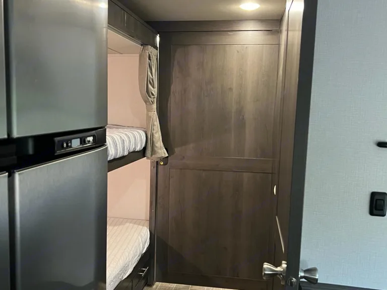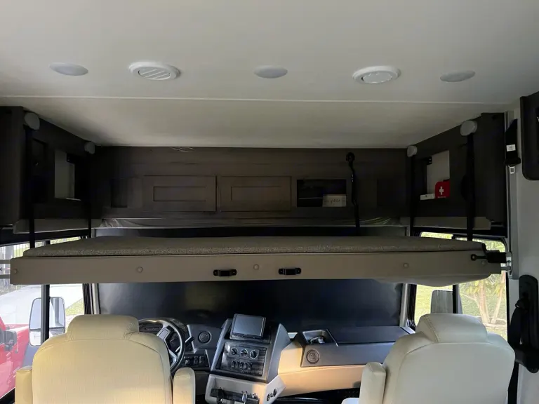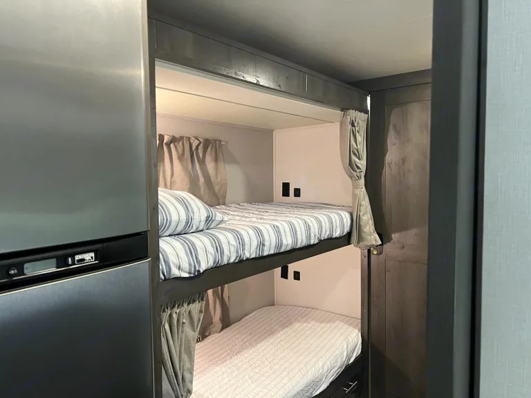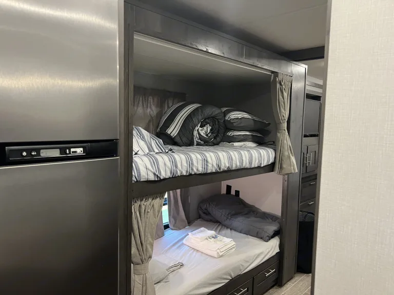 • Sleeps up to 9 people with a king bed, bunk beds, convertible sofa & dinette, and a drop-down bunk above the cab.