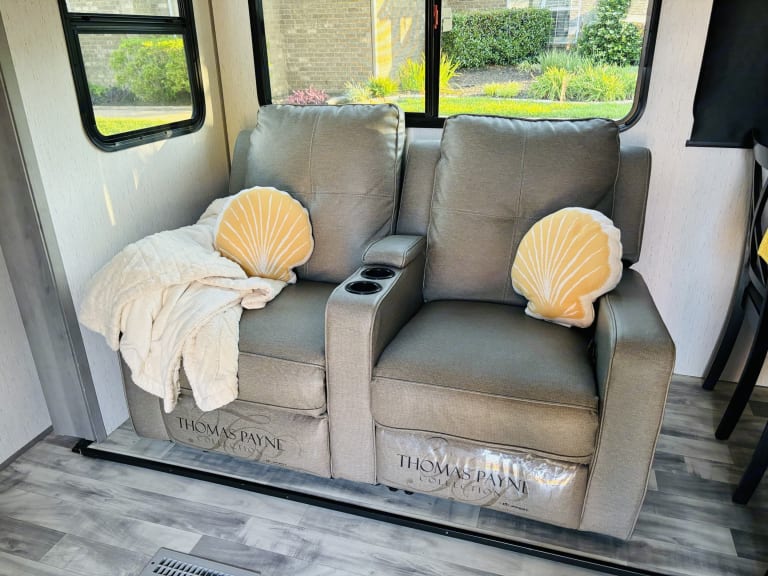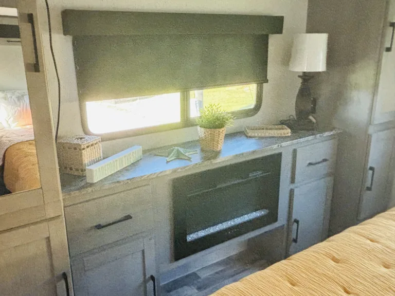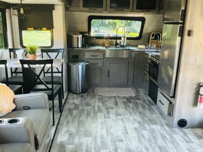 This 2022 Dutchman is perfect for your next adventure! A 33ft with 2 slide outs, fits in most campsites. It has a king size bed, large sink, gas stove, microwave and refrigerator. It has dual AC units, two electric fireplaces and a gas furnace. A large hidden pantry and storage area inside. The living area has two comfortable recliners and a large television annd fireplace . Outside you will find a small griddle and extra storage for all your vacation things. There are also lights underneath awning when it is let out.Ce qui est inclusThis RV is ready for you! It has a king size bed and fireplace in the bedroom. We have a pull out bed that can also be brought out if needed for the 3rd person. We will also provide a playpen for infants if necessary. Fully equipped for you to start your vacation, it comes with an air fryer, a hand mixer, icemaker, Keurig and a toaster. We provide dishes, pots and pans, dish soap and seasoning. If it’s not in there and you need it, you just let us know.. The bathroom comes with towels, wash cloths, toilet paper, soap, hand soap and blow dryer.. It also comes with an extra set of sheets if needed during your stay. We also provide two chairs for under the awning when set up. We deliver our own Camper to campground of your choice. We provide beach 4 towels, we have Floaties/Lifejackets for infants and toddlers if requested and beach toys . We are also able to provide beach chairs, a small grill and a cooler upon request. If you are flying in from out of state, we can arrange for airport pick up for you as well!RecommandationsHere on the GULF COAST, we have the most beautiful sugar white sand beaches! We are close to the Naval Air Station, which you can catch The Blue Angels practicing, A trip to the Naval Museum, or to the lighthouse. We have the newest waterpark in our area located in Foley Alabama. Tropical Falls and OWA Amusement Park. We have so many wonderful restaurants and fun activities for your family in this area for your beach vacation! Autres points à signalerNo smoking inside the camper!