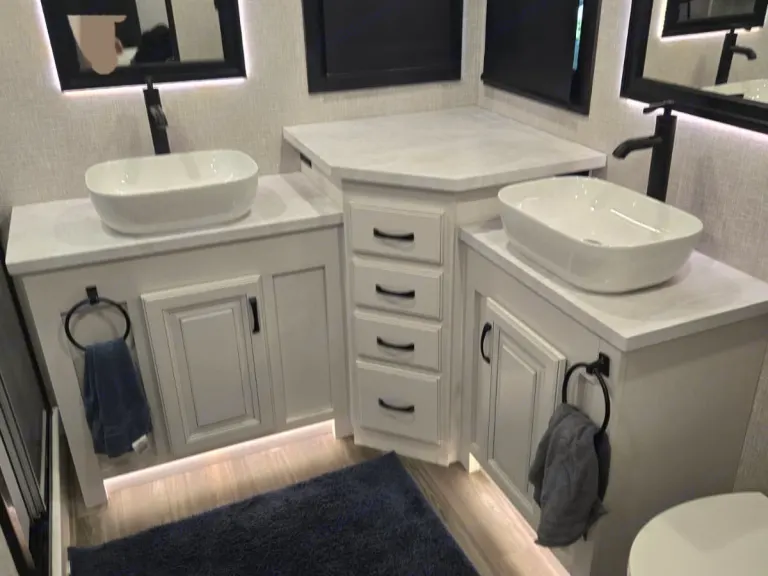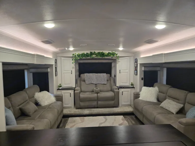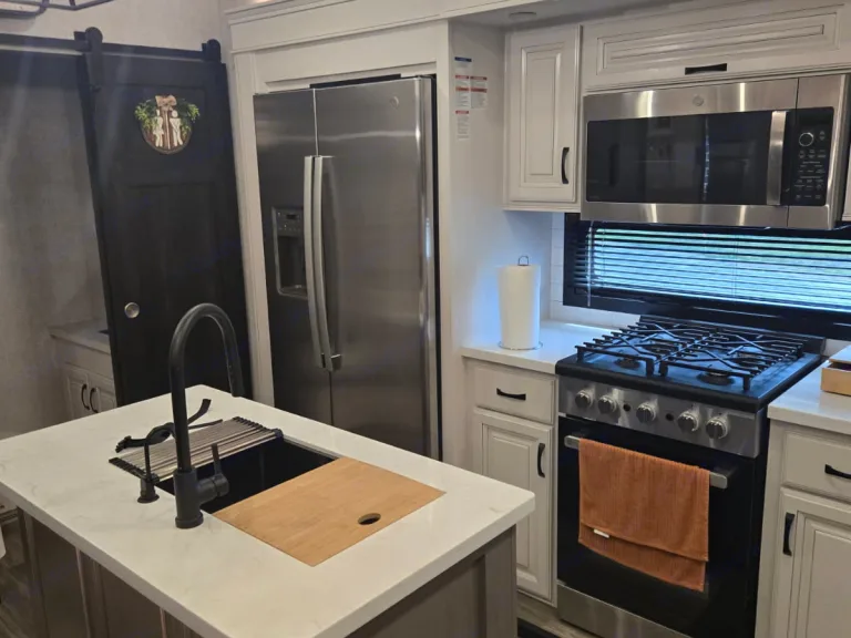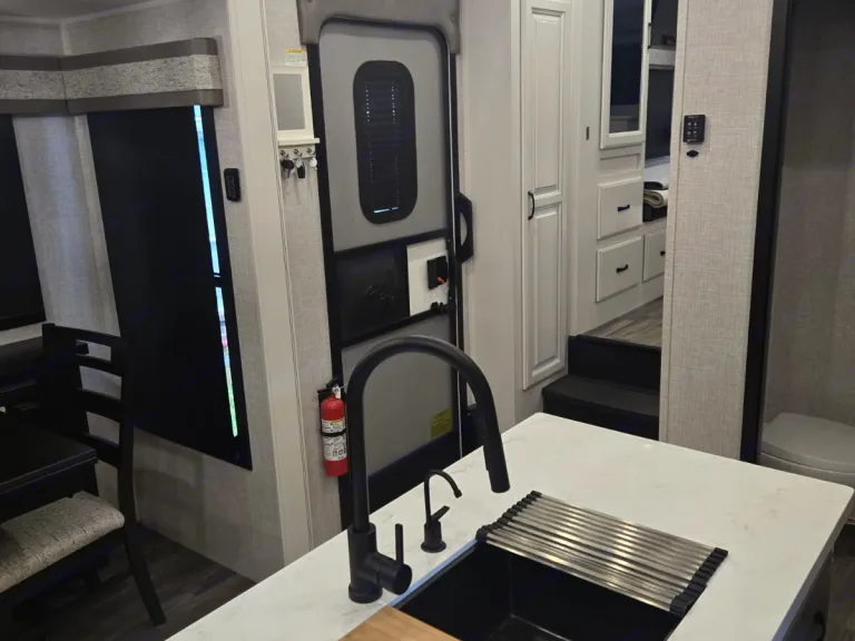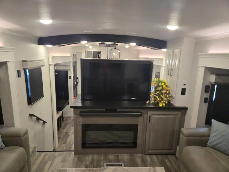 Beautiful front living fifth wheel camper that makes you feel right at home with fireplace, reclining, heating, massaging chairs that have 2 pull out queen sofas on each side and an elevated 60' TV. From there you have the galley with residential appliances, island sink, and full dining room table with room for four, also a half bath. Up the steps enter into the master bedroom with a very comfortable king size bed and overhead television. Last but not least is the master bath with double sink and mirror combo plus full size shower and a washer dryer combo to clean the clothes. Outside is an exterior kitchen that includes a 22in Blackstone, hand washing sink, mini fridge, and outside storage. Ce qui est inclus• Linen for all 3 beds