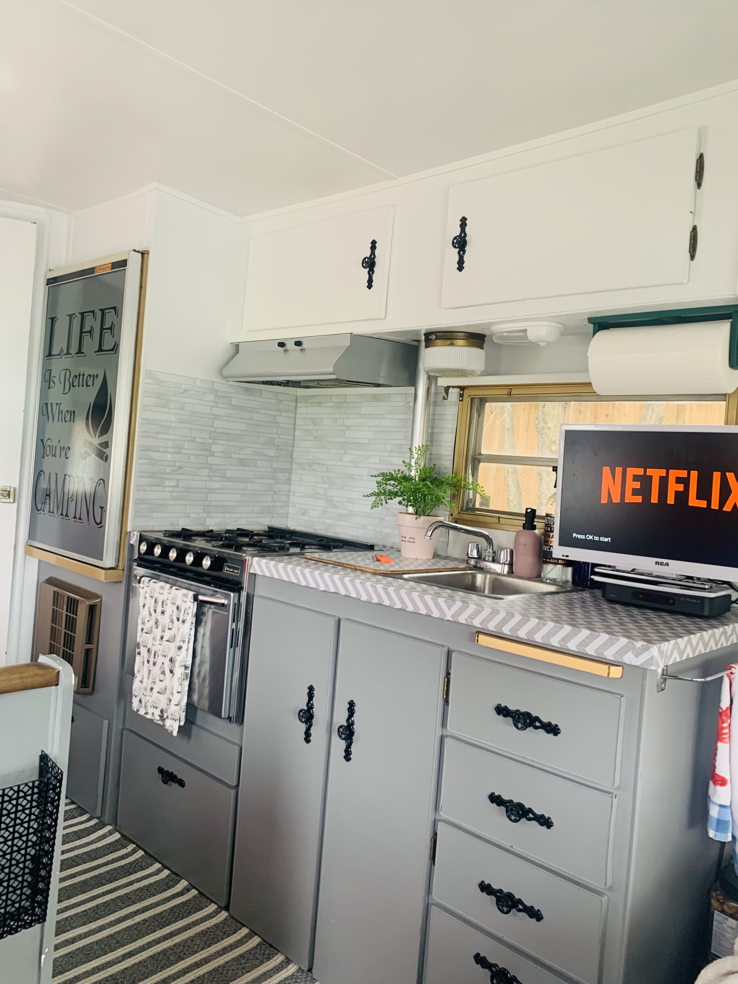 Bohemian chic travel trailer. Super comfy and cozy. Trailer comes with a dinette that folds down into a bed. Sleeps two. The couch also folds out into a double bed and sleeps two. You simply let us know where you want the trailer to be delivered to and it will be delivered. If you don’t have a site in mind and need a site,