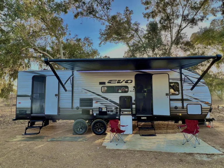You book your trip and we’ll tow and set up to your destination. Less worry and more fun for you :)-28 ft 2022 Forest River Evo