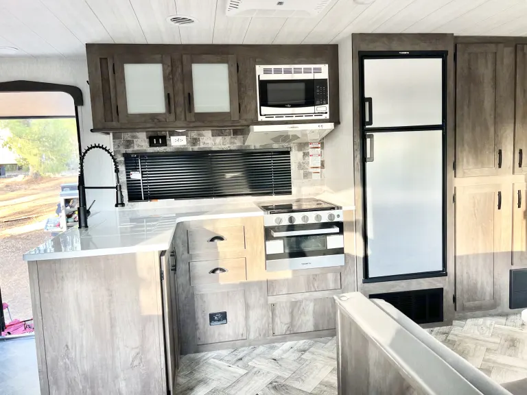 - Couch that converts into a twin•Full kitchen set up including fridge, microwave. Plenty of storage for food•43in smart tv including Netflix, HBO, Stars, and Disney Plus*Fireplace for those cozy nights* Bathroom will be stocked with Hand soap, hand towels, Poo-Pourri, Shower caddy, fresh clean towels, toilet paper, which is a special type only made for RV’s. Nothing else can be flushed due to blockage•Outdoor