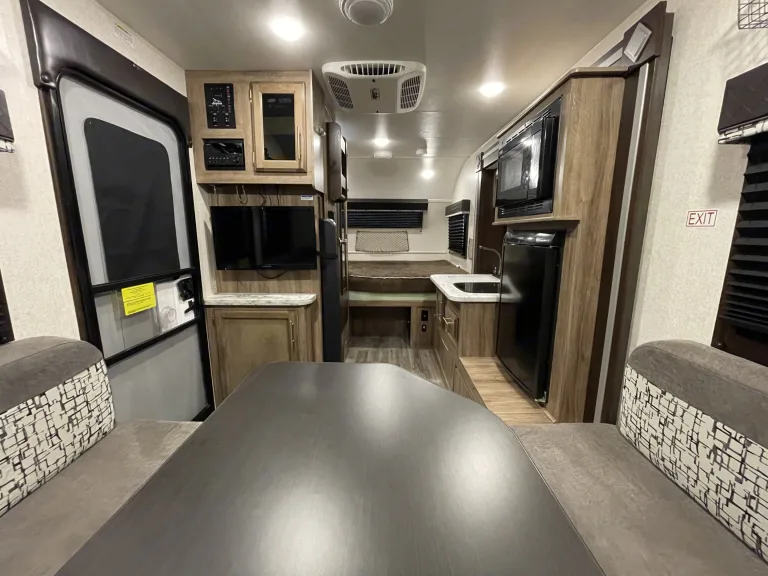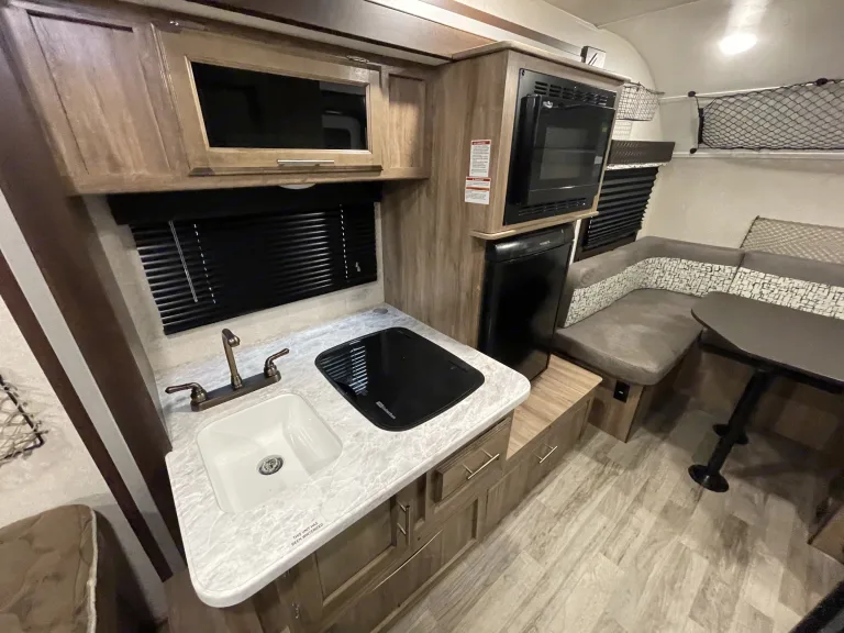 Your family of four will enjoy camping in this ultra light 17FD Hummingbird travel trailer by Jayco. Features that you will love about this model include a single slide out for added floor space, and a front you step inside this travel trailer, to your immediate left there is an entertainment center with storage behind. Along the front of this model there is the u-dinette where you can enjoy your meals during the day, and at night convert this area to sleeping ross from the door there is a slide out with a refrigerator, microwave, a two burner range, and a single sink. Along the opposite side of the trailer, across from the kitchen is where you will find the convenient wet bathroom with a toilet and shower. And located in the very rear of this model is a queen bed.Outside you will find plenty of storage spots, as well as an 8' awning and so much more!