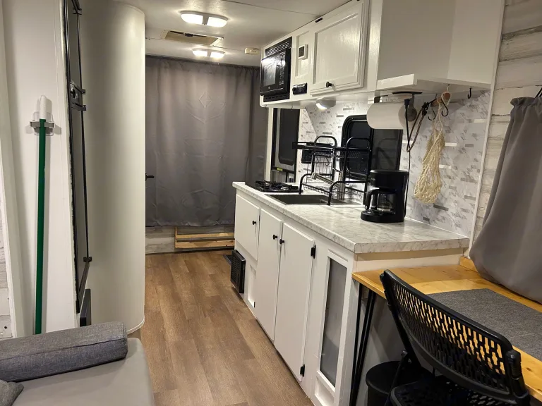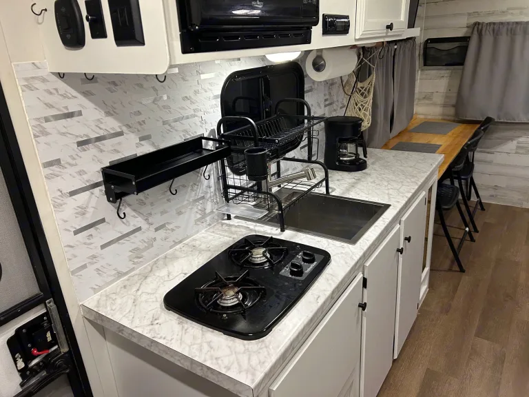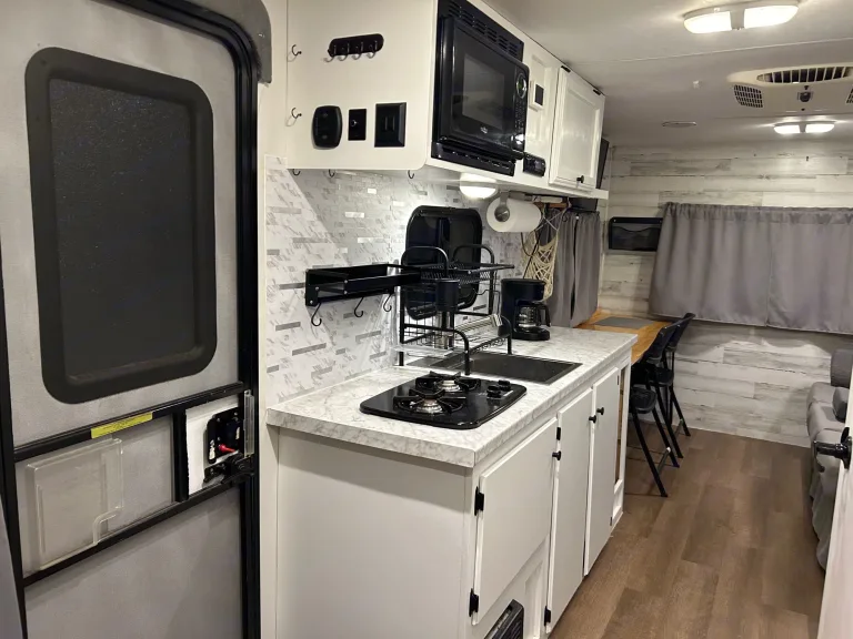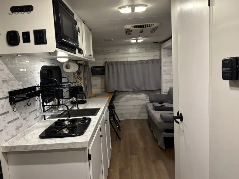 Travel Trailer Specs: GVWR: 4,500 Interior Height: 75" Exterior Height w/ AC: 107" Exterior Width: 90" Exterior Length: 23' 4 1/2" Water Heater: 6 Gallon Fresh Water: 20 Gallon Grey Water: 24 Gallon Black Water: 24 Gallon LP Gas: 20 Gallon tank