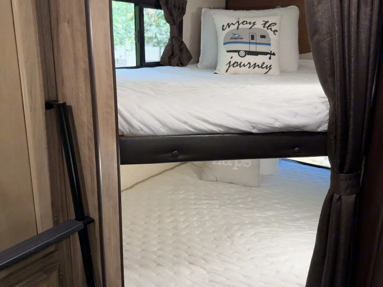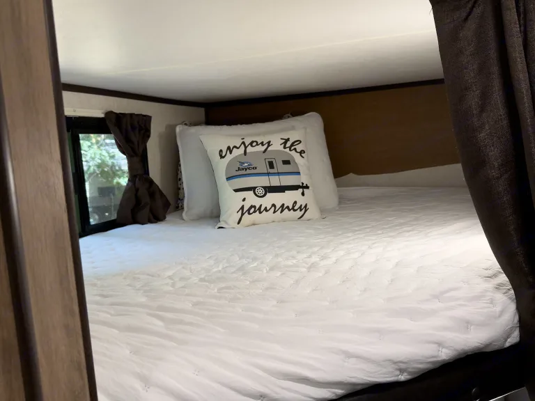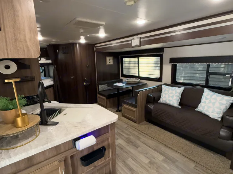 Want to experience the great outdoors in the comfort of an RV that feels like home? Then we have what you need! Our spacious trailer comes with a plush queen size bedroom that has doors for privacy! Also feature full bunk beds and a fold down leather sofa. Trailer comes with everything you need for cooking, cleaning, and just straight relaxing. Great sized shower, swivel TV, and outdoor kitchen make your stay so much cozier. Linens, utensils, cookware, outdoor griddle, everything you need is for your use! Just bring your clothes, toiletries and your favorite food!Sleeping for 6: