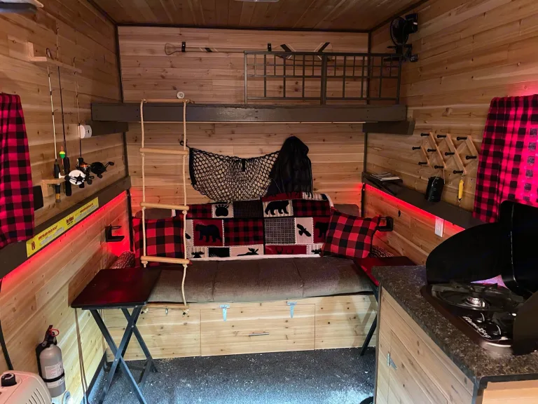 You will have plenty of fun with my 2020 Ice fishing house! Keep warm and stay out of the elements in this 7ft by 14ft unit. The unit weighs around 3,500 lbs. Amenities include wall mounted heater, microwave, gas stove, 6 holes for ice fishing, over head and LED lighting. A gas generator and electronics are also available for an additional charge. Has a couch that folds down to a bed and a bunk above so could sleep 3 if needed. Unit lowers to the ground making it solid as a rock and provides for easy entry/exit with no stairs. No jacks to mess with either, just a winch on each wheel and one on the tongue. It is a very comfortable and reliable unit which will add great memories to your next adventure. Unit is well maintained, everything works and is very well taken care of. Fire extinguisher, smoke and carbon monoxide detectors are installed and all have fresh batteries. Depending on my schedule and your intended destination (Must be within 30 miles of Richfield) I am willing to deliver and set-up prior to your arrival for an additional fee. Otherwise you can use on a lake I’ve recently fished for no extra charge-setup included. Feel free to message me with any questions. I look forward to sharing my Ice Hassle with you! Ce qui est inclusBunk bed cushion (you need to provide your own linens), stove, heater, TV (limited reception depending on area), 6 ice holes and covers.Autres points à signalerPlease note, this is an ice house so no bathrooms available.