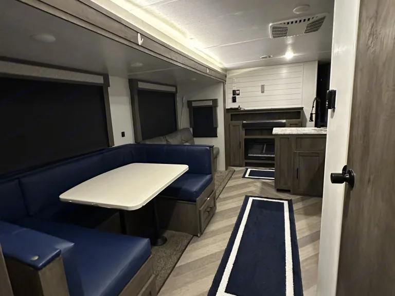 Our fully stocked cozy RV is waiting for you! It’s perfect for all glampers! (Hotel like feel)Family RV trailer, perfect for families with small children. Trailer sleeps 8 comfortably, includes private bedroom with queen size bed and Bunk room with 3 twin beds! Dining table coverts to full bed and sofa futon. Lots of space for the entire family. Clean blankets and sheets provided for all beds!.The outside of RV has an awning, small frig and an attached grill. There is also outside shower on the outside of the RV for rinsing off. BBQ cooking utensils included.This RV is equipped with 2 TVs, Blu-ray player with dvds and Electric Fireplace, which also provides heat. Great for Summer Fun with the Family. All essential household items included, example toaster, coffee maker, small blender, utensils, small pots, cutting boards, bathroom towels and dinnerware. NO Smoking please!Rent our RV without the hassle of storing!