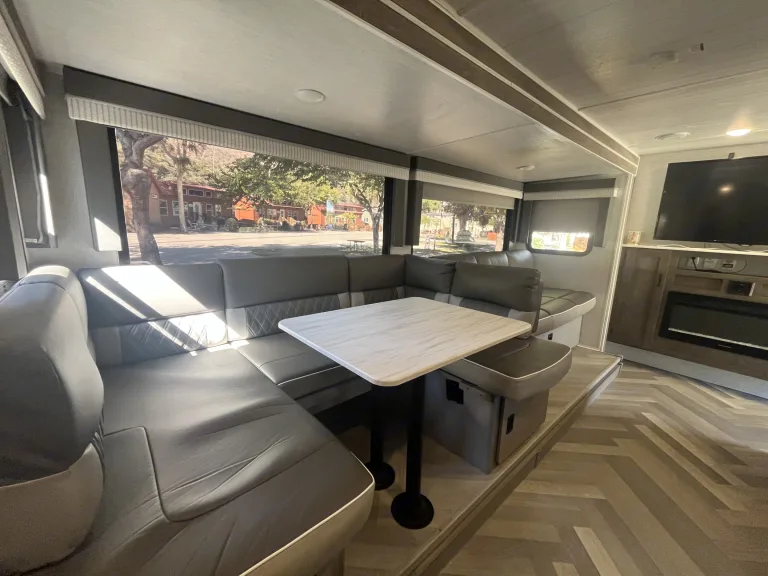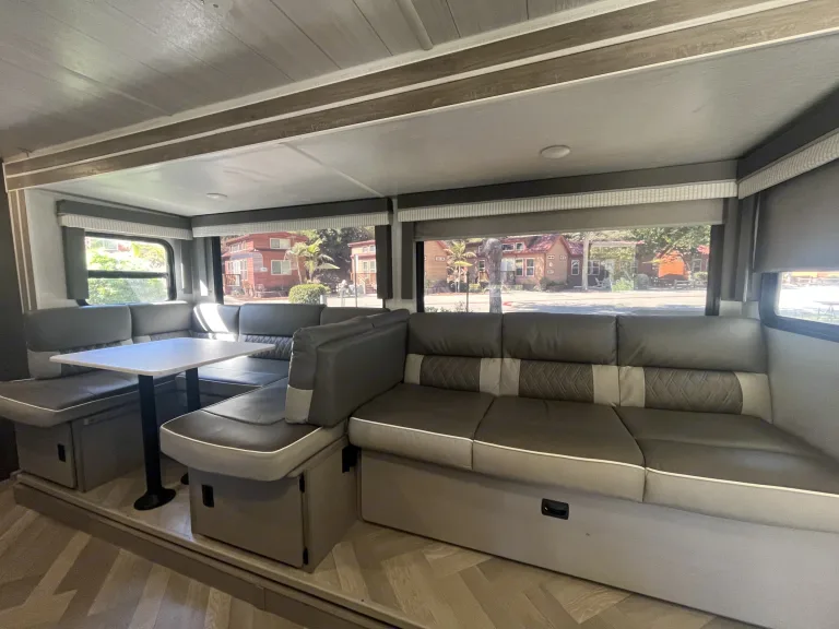 This fully-equipped RV includes all kitchen essentials, linens, and even outdoor furniture.