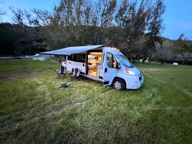 This van has everything from a microwave to an outdoor shower to an indoor shower. Everything you need on wheels and the sun charges up any extra battery bank you may need.