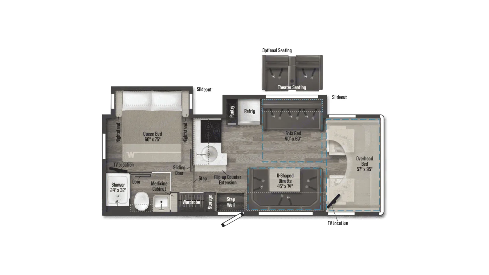 Relax in a private queen bedroom, spacious dinette, and cozy over-cab bunk area.