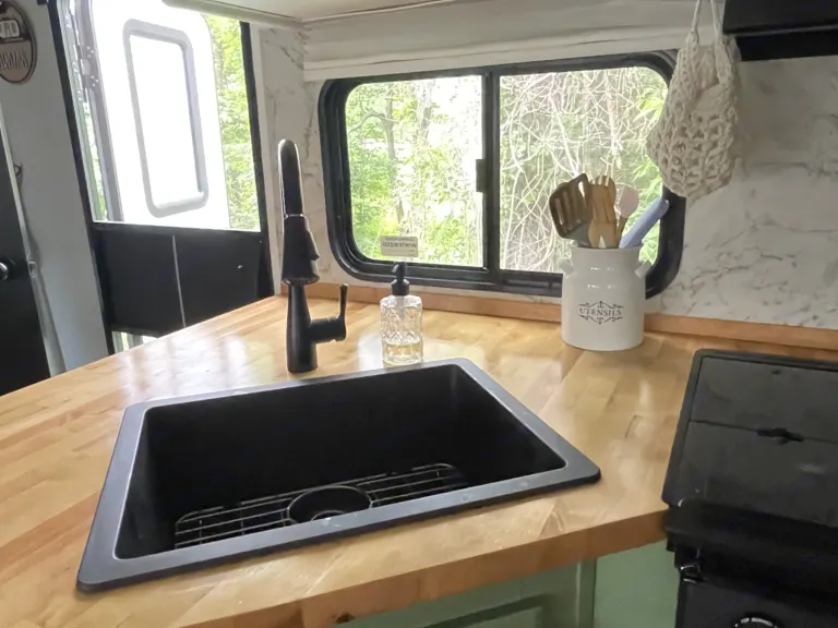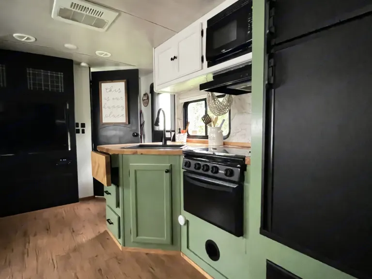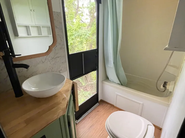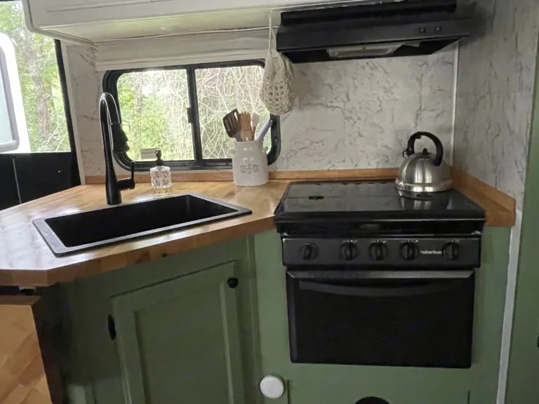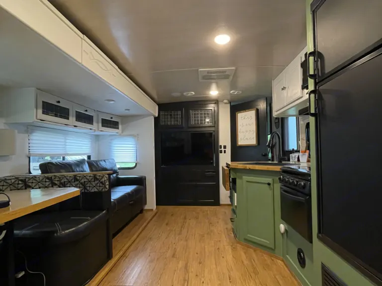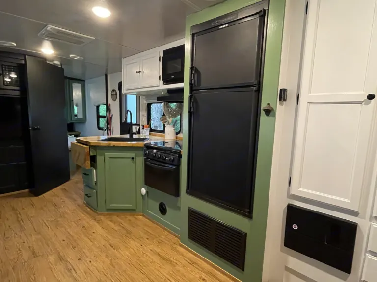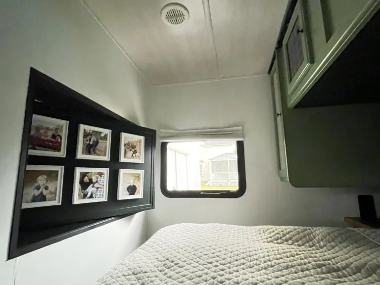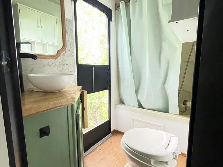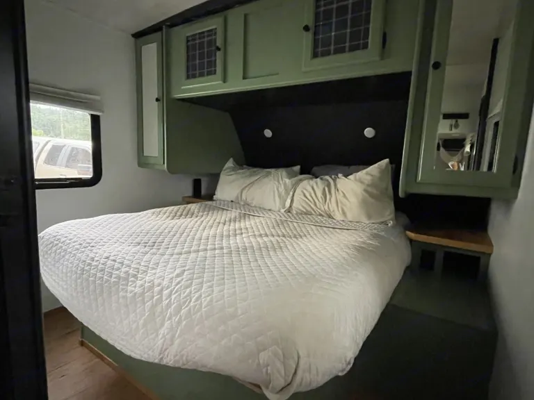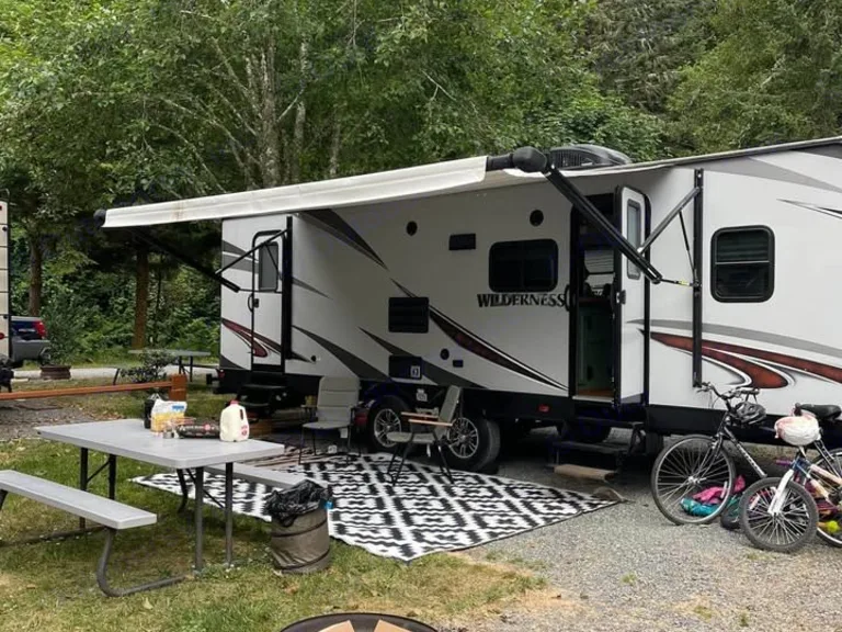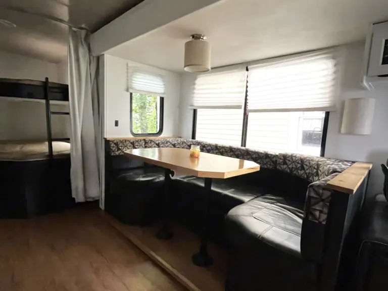 Sleeps 6 comfortably: private queen bedroom + full-size bunks + convertible dinette + pull out sofa.Full kitchen: fridge, freezer, stove, oven, microwave, sink, pots & pans, utensils, coffee makerFull bathroom: flush toilet, hot shower, small tub—no campground bathhouse neededClimate control: air conditioning & heat for year-round comfortDining space: indoor booth for meals, games, or rainy-day relaxingOutdoor Setup: We keep things simple and cozy—outdoor living without the fuss. We provide: