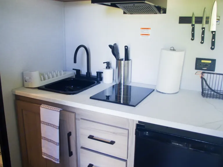 Perfect for couples but also it can fit up to 4 people . Dogs are welcome!Features include shower, toilet, microwave, refrigerator, induction cooktop and fireplace!Everything to make your getaway experience comfortableCe qui est inclusAccessories