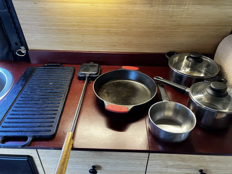 Please cook all strong-smelling foods outside of the van. Smells can lingerPlease clean by wiping up your spills and cleaning up.