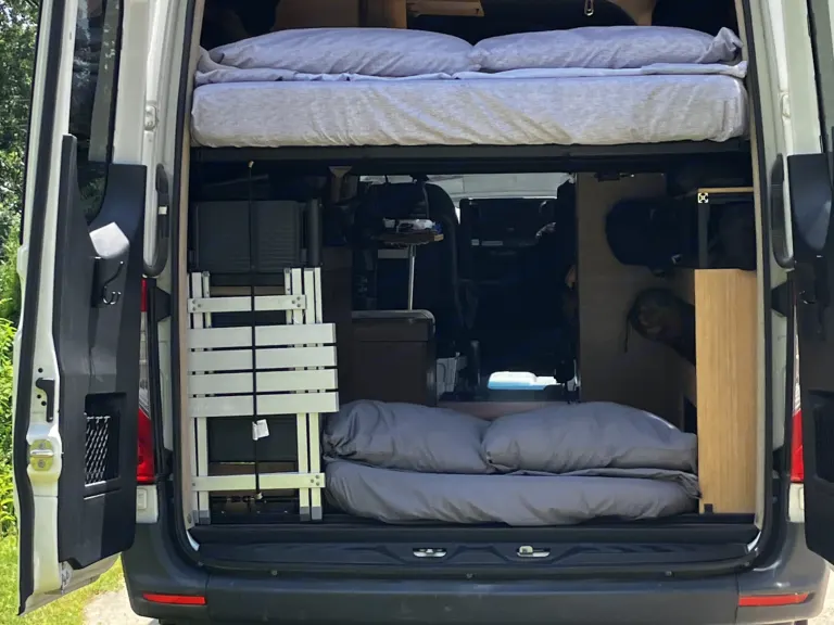 • Up to 5 camping chairs and 4 additional tripod chairs are on the side shelves in the storage area, along with the shades for the windows