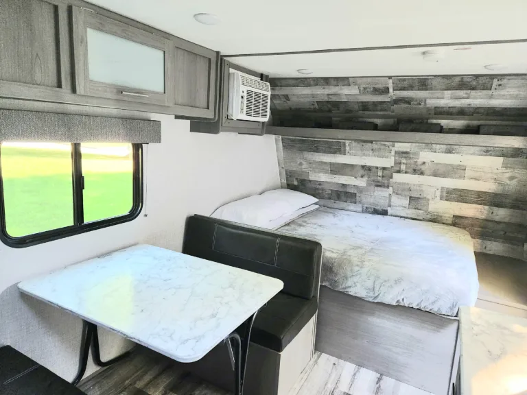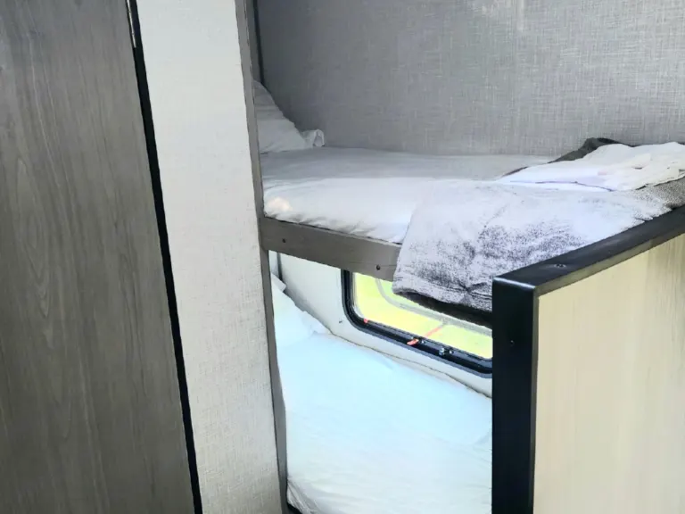 This camper is the perfect mix of compact and spacious. Comfortable queen bed with a 4 inch memory foam topper, a dinette conversion bed, and two twin bunk beds can sleep 5 comfortably or 6 if you have two smaller children on the dinette conversion bed.Plenty of storage to fit your needs with compartments under the beds and the dinette, as well as overhead cabinets and shelving! Also features an additional exterior storage compartment.All of the conveniences of home with the refrigerator, microwave, 2 burner stove, A/C, and fireplace heater.Perfect camper to sit in the shade under the awning and drink your morning coffee before starting your adventure!Ce qui est inclusWe have included: