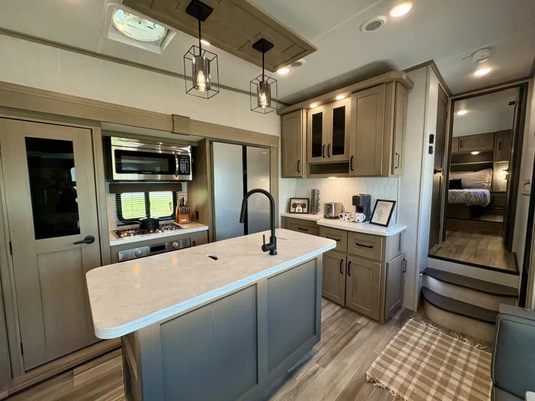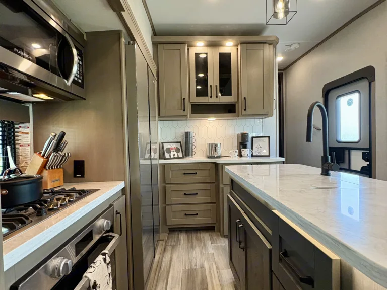 Refrigerator: 16 cu ft 12V refrigerator.Cooktop: 3-burner range with oven.Microwave: 30" stainless steel microwave.Sink: Deep undermount kitchen sink with solid surface covers.Storage: Kitchen island, pantry, and overhead cabinetsMaster Bedroom