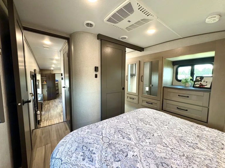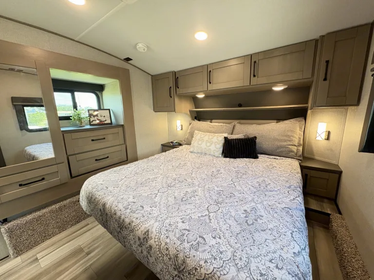 Bed: 60" x 80" queen bed with a pillowtop Denver mattress.Storage: Wardrobe with mirrored doors, dresser, and underbed storage.Lighting: LED lighting.Bathrooms