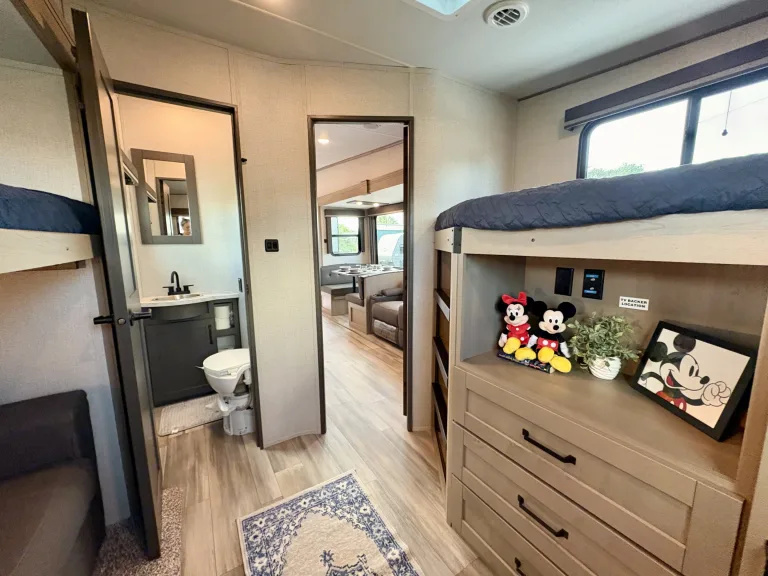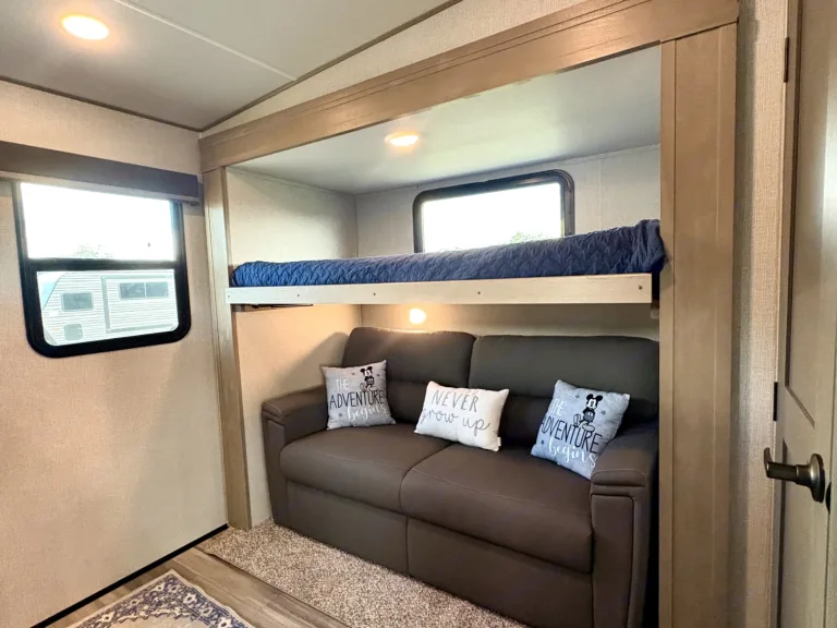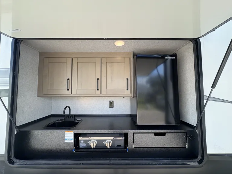 Bunks: Upper bunk above the outdoor kitchen and fold-down bunk above the trifold sofa.Storage: Shelving beneath the upper bunk and additional storage areas.