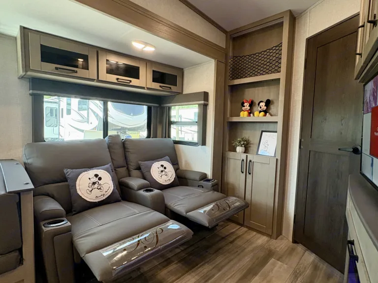 Sofa: Tri-fold hide-a-bed sofa with overhead bunk above.Theater Seating: Dual recliners with heat and massage functions.Entertainment Center: Equipped with a high-definition LED TV and residential fireplace.Dining: Dinette that converts to a bed.Kitchen