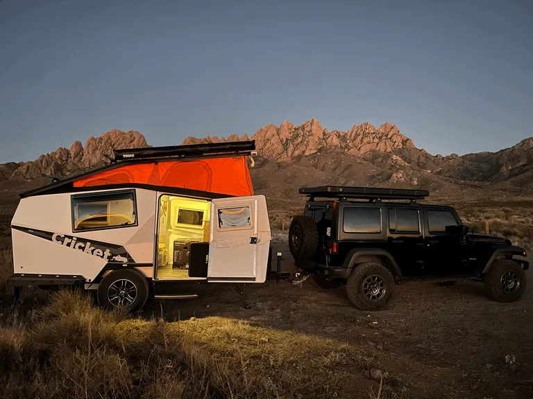 This brand new fully equipped custom 2023 Taxa Cricket is ready for some serious adventures. Comfortably sleeps two full size adults and will also accommodate two small children (less than 100 lbs and shorter than 5 feet) in the overhead bunks/berths. Two 20lb. propane tanks provide plenty of fuel for the 2 burner stove and onboard furnace/water heater while out for more than a week under normal use. The Cricket can be hooked up to shore power and city water or accommodate users off the grid with it's onboard 15 gallon water tank and 16 gallon grey water tank. The 140 watt brief case style solar panels are available to recharge the 100 amp hour lithium iron phosphate battery so you have plenty of light inside and outside of the trailer and can keep your phones/tablets charged and foods/beverages cold in the onboard 12v Domestic 45L fridge. The onboard battery can also be charged using the 7-pin trailer/vehicle plug while driving. If your vehicle is not equipped with a 7-pin plug receiver, no problem, owner has a 7-pin to 4-pin converter.At less than 1,800 lbs in weight, this ultra light trailer that was designed and built by a former Nasa engineer, can be pulled with most vehicles, including many 4-cylinder cars, that have at least 2,000 lbs town capacity and a 2" trailer receiver hitch. This trailer tracks and pulls great behind Jeeps, small SUVs and small to mid-size trucks with the hitch height of about 20". Trailer is equipped with a Lock N' Roll 360-degree 3-axis articulating hitch and receiver that fits in a 2" receiver.Whether your next camping trip is to an established campground or somewhere off the lightly beaten path, enjoy it with friends and family in comfort by booking this ultra cool and comfortable 2023 Taxa Cricket.Ce qui est inclus2 burner propane stove, 12v Domestic fridge, Truma onboard hot water heater and furnace, cookware and kettle, camping table, 4x place setting, outdoor awning, 140 watt solar brief case, 2 camp chairs, quick release water sprayer (for outdoor shower), 25' BPA free potable water hose, 15A Male to 30A Female 12inch Power Connector (CR1530), portable toilet seat with biodegradable toilet bags, toilet paper, paper towels, surface cleaning supplies, garbage bags. RecommandationsOwner is experienced traveling by vehicle all over the southwest and recommends 3-7 day trips in AZ, CA, NV, UT, CO and NM as all can be easily reached in these time frame and very pleasant. Owner has a preference for dispersed mountain camping sites between April and October and dispersed low desert or beach locations during the fall and winter months. Autres points à signalerRenters are responsible for bringing their own sleeping bags, pillows, and bedding. Renters should return the trailer in clean condition just as it will be delivered. A cleaning fee will be charged if the trailer is returned dirtier than it was received. Owner takes good care of this and expects renters to do so as well but is reasonable with light or normal wear and tear.Absolutely no smoking in trailer, no festivals or concerts, and no trips permitted out of the United States. Winter travel is not permitted except to low desert locations in AZ and beach locations in CA (necessary to avoid frozen pipes and plumbing fittings/fixtures). Have any questions, ask the Owner.