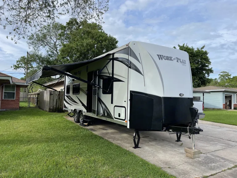 2017 Forest River Work and Play. It weighs approximately 7500lbs. It has two ac units on the roof. 50amp service. Power awning. Two propane tanks. LED lights through out the whole trailer. It has a queen mattress in the bedroom and a queen mattress on the loft great for kids. There is a weight limit on the loft of 300lbs. Ce qui est inclusIt includes sewer hose, water hose, fresh linens, towels fold up table. Keurig coffee maker and kitchen utensils and pots and pans.