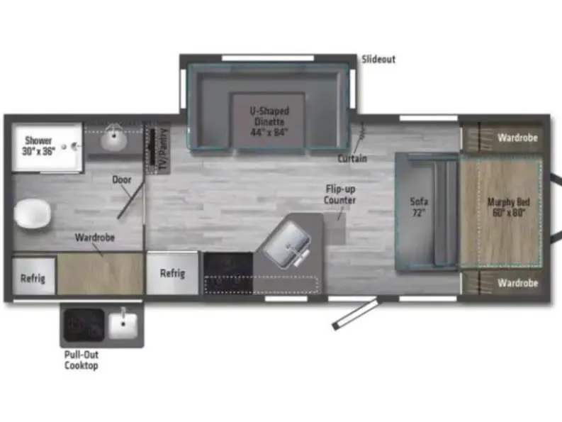 Dinette sits 4 (drops down for second bed). Outdoor kitchen w/ griddle, minifridge, charcoal grill, sink, coffee pot, and toaster. Powered stabilizer arms for front & rear w/ "X"/scissor chalks.