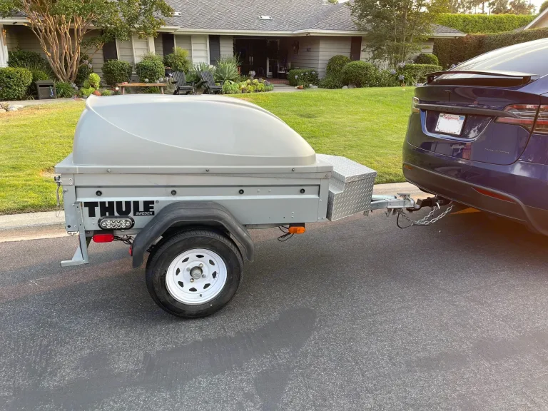 Thule 1205 Perfect for any size vehicle when you need extra storage while traveling. Makes the perfect travel buddy for Tesla vehicles or any other EV vehicle large or small. Trailers smoothly and its aerodynamic design will minimally affect EV range.Ce qui est inclusTrailer OnlyRecommandationsRenter must make sure the tow vehicle has a tow lights receptacle to plug into. Also, the vehicle must have a 2-inch tow ball.Autres points à signalerTrailer must be picked up and dropped off at the owner's location unless delivery is requested.