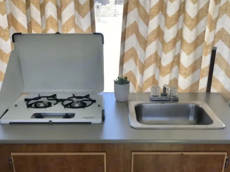 Easy to tow and set up, it sleeps 6 with essential kitchen and bath.