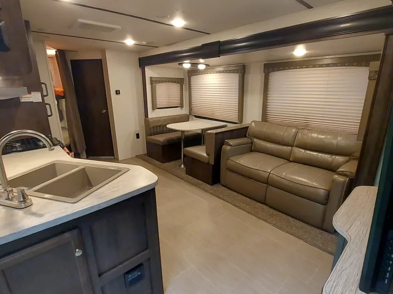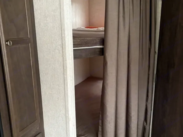 Ready for family adventures? Enjoy camping in this unique 33 ft trailer! Its got privacy for the parents and ample room for kids! There is a queen bed in the master, double-over-double bunk beds, a pullout couch and a collapsing dinette makes for lots of sleeping space. This bunkhouse has a maximum sleep capacity of 10 but comfortably sleep 8 adults. The large driver side pop-out gives lots of open floor space! There is a TV for those rainy days with provided DVDs to choose from!