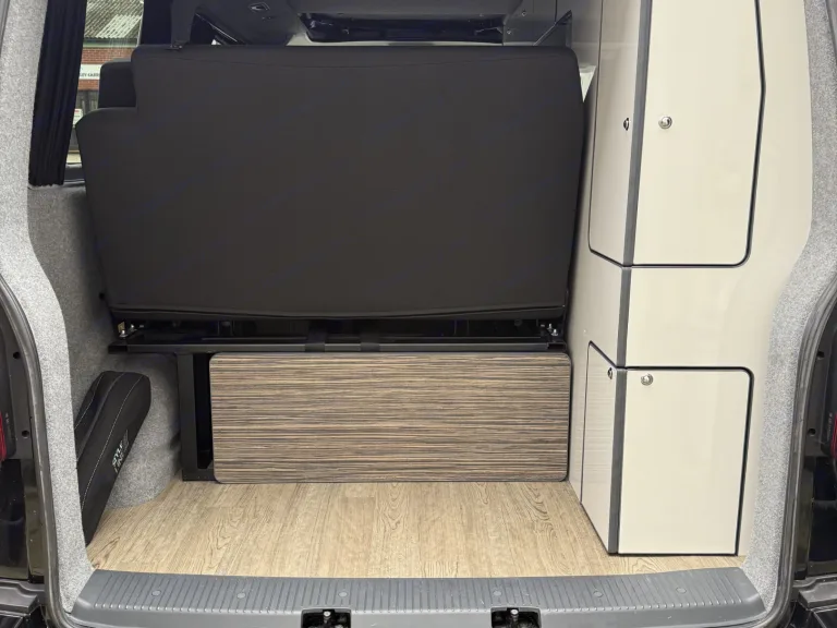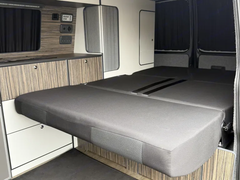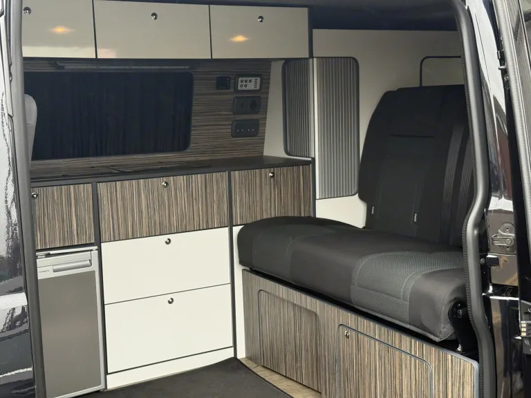 When you're on the move, our campervan comfortably seats Five, and have plenty of space and storage for your clothes, bedding and food. Externally they're not much bigger than a people carrier, so are easy to drive, turn and park anywhere. The campervans are fitted with reversing sensors to help out on tricky spots too. Under the bonnet our camper vans have a modern 1.9TDi engine, which can carry you for over 600 miles on a single tank.When you've arrived at your perfect spot, the campers sleeps two people on the fold out rear seat, and there’s more bed space in the roof, as well as a bedroom in the optional awning. Both beds are ready in a matter of seconds, and fold away just as quickly. There's storage throughout, a fridge freezer, a sink, and a double Gas hob and a Diesel heater for the cooler nights. LED lighting is fitted all around the vans which will run off the leisure battery, and there are 12v and 240v sockets so you'll always be able to charge your phone! The front seats swivels round to face the rear, so everyone can sit around the table. For safety there's a fire extinguisher and smoke alarm, and insurance and breakdown cover is included in the price.