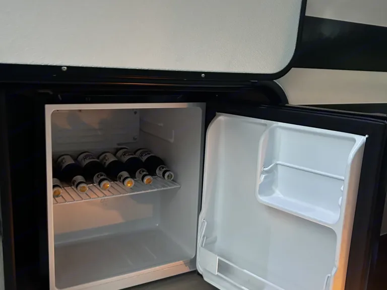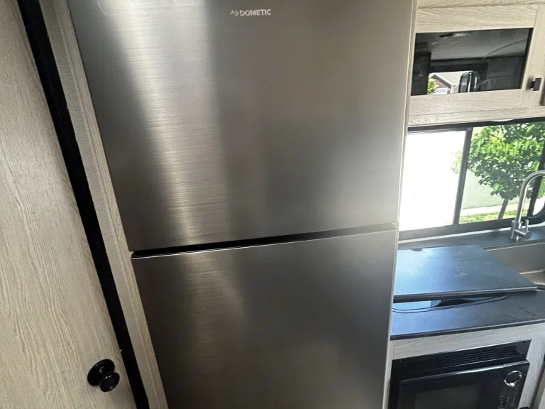 Large stainless steel sink and large fridge with freezer. Also comes equipped with a microwave!
